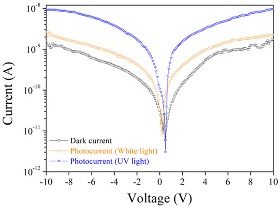 Finally, we tried to understand the photodetecting behavior of the fabricated (C4H9NH3)2PbBr4 2D perovskite film. The current and voltage (I–V) behaviors of 2D perovskite under different light environments were observed through a simple metal–semiconductor–metal (MSM) design, and the results are shown in Figure 9. Because the absorption spectrum of this 2D perovskite was in the UV wavelength range, as shown in Figure 5d, the photocurrent under the I–V measurement, compared to the dark current, was observed to increase obviously under UV light irradiation compared to white light illumination. The photocurrent of 2D perovskite increased by one order of magnitude compared to the dark current under UV light irradiation.