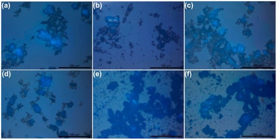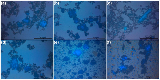 Many stage I and stage II GICs are colored. A rich blue color is observed in optical microscopy pictures both 2 h and 24 h from the start of the synthesis, indicating the formation of stage I GBS [18,19]. The abundance of blue zones is approximately the same and does not depend on the duration of the synthesis. Therefore, we can conclude that the GBS of stage I represented by the formula is stable under the synthesis conditions in a medium of conc. H2SO4. We can also note that the GBS of stage I is more likely to form in the central part of larger crystallites, irrespective of the oxidizing agent. Blue areas are commonly surrounded by crystallites of darker color, which vary from black to brown-yellowish tint. These crystallites might be attributed both to non-intercalated graphite and GBS with a lower staging index [19,20]. Single inserts of this color can be detected in the micrographs of all GBS samples. However, the shape and tint of the brown-yellowish inserts of the GBS samples obtained using CrO3 (Figure 1e,f and Figure 2f) are slightly different: some of them are lighter in color with more expressed yellow tint and more regular shape. Such a difference may occur due to the presence of either orange-yellowish CrO3 crystals or miscellaneous Cr(VI) compounds [21].