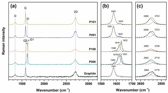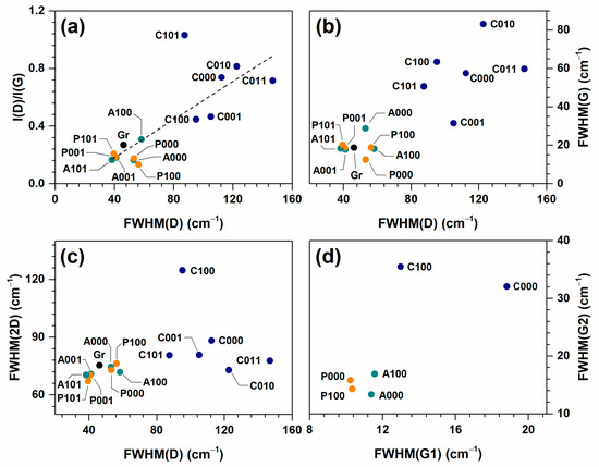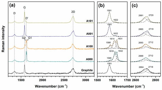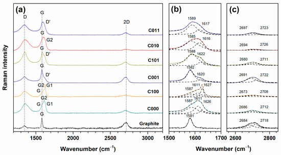 Raman spectroscopy may help reveal the defectiveness of the carbon materials, staging indices, and the amount of stacked graphene sheets in a layered graphene-like material [19,22,23,24]. Raman spectra of all samples are provided below (Figure 3, Figure 4 and Figure 5), and data obtained from the analysis are presented in Table 2 and Figure 6.