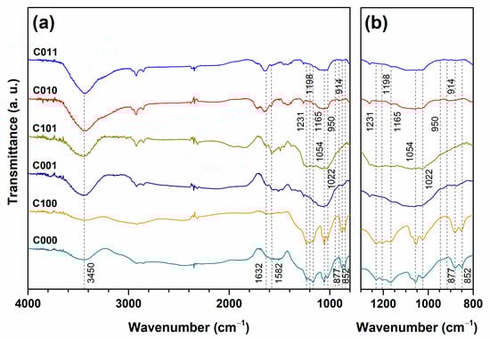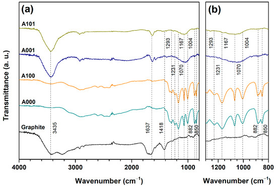 FTIR spectra were employed to determine the functional groups that emerged on the surface of the GBS products obtained using three oxidizing agents: (NH4)2S2O8 (Figure 7), K2S2O8 (Figure 8), and CrO3 (Figure 9). Additionally, the spectrum of the graphite precursor is presented (Figure 7), where the low intensity of the peaks represents a low concentration of surface functional groups in pristine graphite. The most characteristic features are the following: the absorption band at 3435 cm−1 (stretching vibrations of the O–H bond), band at 1637 cm−1 (stretching vibrations of the C=C bond), and peak at 1418 cm−1 (deformation vibrations of the C–OH bond) [28,37]. The addition of an oxidant increases both the intensity and variety of peaks in the FTIR spectra. Some newly appeared peaks may correspond to the SO2 asymmetric stretching vibrations (1293 cm−1) and S=O (1070 cm−1) groups [13,38]. Peaks at 1231 cm−1 and 1167 cm−1 may be related to C–O vibrations [28,39,40]; the peak at 1004 cm−1 can be assigned to graphitic domains C–O vibrations [41,42], while 882 cm−1 and 850 cm−1 may correspond to out-of-plane vibrations of the C–H bond [42]. The broad feature in the vicinity of 2700−3100 cm−1 might be related to O−H stretching vibrations of strongly hydrogen-bonded carboxylate groups or adsorbed water molecules and C−H stretching motions [27]. In addition to these bands, the peak at 1117 cm−1 (asymmetric SO42− vibrations) appears in the FTIR spectrum of the P001 sample [43]. In the spectra of GBS products obtained using CrO3 (C010 and C011), minor bands that indicate the vibrations in the Cr=O group (950 cm−1 and 914 cm−1), are also introduced [44]. After thermal treatment, absorption bands related to oxygen-containing groups in the fingerprint area mostly disappear, though a band in the vicinity of about 1070 cm−1, which indicates the presence of S=O group, remains. As can be seen, during the intercalation of graphite, some of the carbon double bonds can be oxidized by strong acids, leading to the formation of oxygen-containing functional groups, and sulfur derivatives can be intercalated into the graphite structure [45]. In addition, analysis showed that the functional groups introduced during the intercalation process were not influenced using different persulfate oxidizing agents; however, using CrO3 oxidizer determined that a small part of Cr=O groups was formed during the synthesis reaction.