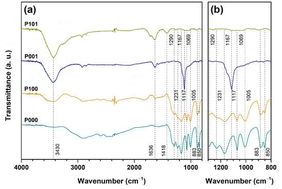FTIR spectra of GBS products obtained using K2S2O8 oxidizing agent in the region of 4000–800 cm−1 (a) and 1300–800 cm−1 (b).