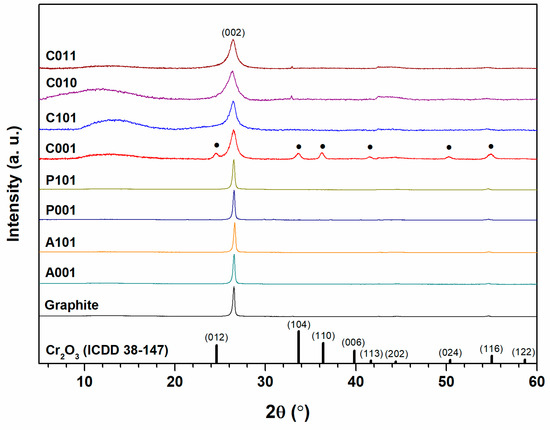 The use of (NH4)2S2O8 and K2S2O8 oxidizing agents made it possible to obtain GBS products which, after annealing, return to the graphite-like structure: the peak positions, crystallite sizes and interplanar spacing of A001, A101, P001, and P101 closely coincide with that of pristine graphite (Table 3). Different results were obtained using the CrO3 oxidizing agent. The peak (002) is clearly broadened compared to that of pure graphite. This is most likely caused by the drastic decrease in average particle size. As in most cases, smaller particles lead to broader reflections as estimated by the Scherrer equation. Such a result is observed not only for the annealed GBS products, but also for sample C010, which is obtained by adding water at the end of the intercalation reaction. A broadened peak with the maximum position at about 11.5° in the XRD pattern of the C010 sample supposedly indicates the presence of the structure, which is similar to that of graphite oxide. Furthermore, compared to the graphite, the (002) peak is shifted to lower 2θ angles and the interplanar spacing is increased from 0.335 nm up to 0.337 nm in GBS products obtained with CrO3. A shift to lower angles can occur due to the presence of defects in the crystal lattice [13]. This observation, together with the Raman analysis, indicates that the GBS produced with CrO3 can have a significant number of defects. Additional peaks (marked with dots) were also observed in the XRD patterns, where CrO3 was used. These peaks may indicate the presence of Cr2O3. This compound can be formed when CrO3 remains in the mixture and decomposes into Cr2O3 during thermal treatment [46]. The Cr2O3 reference pattern (ICDD 38-147) is shown in Figure 10 for comparison.