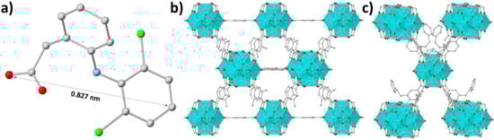 Representation of the structures of (a) diclofenac sodium salt, (b) MOR-1 and (c) MOR-2. Color code: C, grey; Cl, green; O, red; N, blue; Zr, cyan.