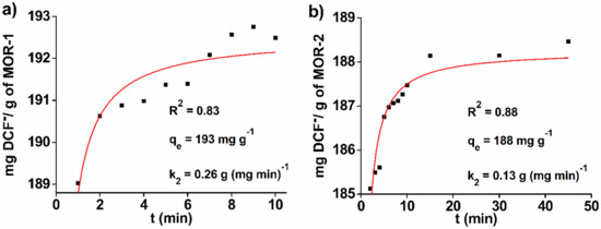 where qt = the amount (mg/g) of ion sorbed by the MOF at different reaction times (t), qe = the amount (mg g−1) of ion absorbed in equilibrium, KL = the Lagergren or first-order rate constant and k2 is the second-order rate constant [g/(mg∙min)] [42]. The fitting parameters of the above are presented in Table 1. According to the correlation factors (R2), the Ho and Mckay’s pseudo-second-order equation could better describe the kinetics data for DCF− sorption by MOR-1 and MOR-2 than the pseudo-first-order model, indicating that chemisorption process occurs for DCF− binding [43]. Furthermore, the rate constants (Table 1) indicate faster sorption of DCF− anions by MOR-1 than MOR-2. Presumably, the diffusion of the relatively bulky DCF− anions is facilitated by the larger pores and channels of MOR-1 (pore sizes for MOR-1 and MOR-2 are 0.83–0.88 and 0.55 nm, respectively).