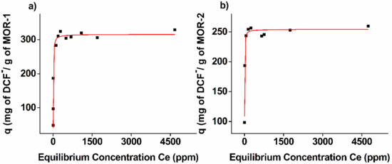 Equilibrium DCF− sorption data for (a) MOR-1 and (b) MOR-2 materials (pH ~ 7). The solid line represents the fitting of the data with the Langmuir model.