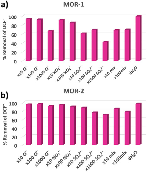 DCF− sorption data for (a) MOR-1 and (b) MOR-2 in the presence of various competitive anions.
