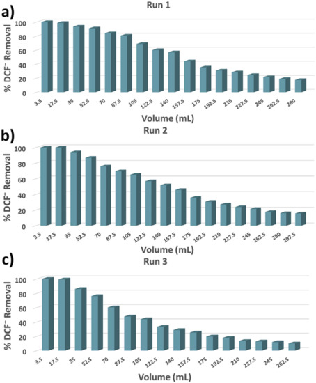 In light of the remarkable sorption capacities of MOR-1 towards DCF−, we extended our studies to the investigation of the sorption properties under continuous flow conditions. However, pristine MOR-1 cannot be utilized as stationary phase in columns, considering that this material is isolated as a fine powder and its use in columns results in column clogging or release of the material to the flowing solution. Thus, we utilized the composite form of MOR-1 with alginic acid (MOR-1-HA) [37]. As in our previous studies [37,38,46], the column is filled with a mixture of the MOF composite material and silica sand (MOF composite:sand mass ratio = 1:100). Column sorption studies were performed with a DCF− solution of initial concentration ~20 ppm (pH ~ 7). These investigations revealed that 10 mL of effluent contain no detectable DCF, whereas relatively high removal capacities (>70%) were observed even after passing 50 mL through the column (Figure 5). The sorbent can be easily regenerated by washing it with HCl solution (1.2–4 M). After the regeneration, the column can be reused showing removal capacities close to those of the first run. Even after a third run, the column largely retains its initial sorption capacity.