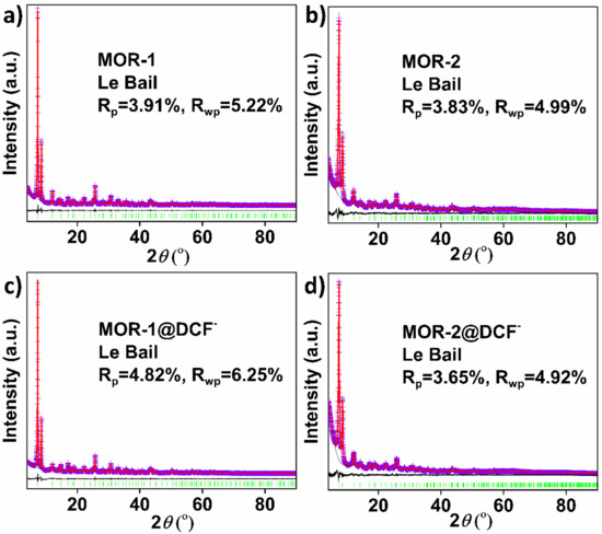 The zeta potential of the MOR-1 and MOR-2 at pH ~ 7 was calculated close to zero (−0.214 and −0.417 mV, respectively), indicating neutral surface charge. EDS data further confirmed this evidence since no Cl− was detected for both materials. These results indicate that electrostatic interactions of MOR-1 and MOR-2 with DCF are not likely. Powder X-ray diffraction (PXRD), unit cell indexing, and Le Bail refinement data for the pharmaceutical-loaded MOFs revealed that the structures of the MOFs were retained after the sorption process (Figure 6).