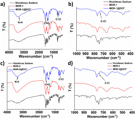 FT-IR data for the DCF-loaded MOFs indicated characteristic features of the organic molecules indicating the successful binding of the DCF− anions (Figure 8). The most evident change is the appearance of the characteristic band at 740 cm−1 in both MOR-1@DCF− and MOR-2@DCF− spectra, corresponding to the C-Cl stretching [47]. Furthermore, the changes observed in the region from 3500 to 3300 cm−1 are attributed to the N-H stretching of the secondary amines. In addition, both spectra display a slight shift of the C=O stretching band from 1568 to 1573 cm−1 (MOR-1) and from 1571 to 1576 cm−1 (MOR-2) after the DCF− sorption process, suggesting the participation of the carboxylic acid groups in DCF− sorption [47].