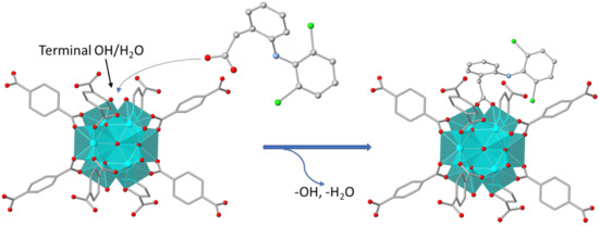 - Hasan, Z.; Khan, N.A.; Jhung, S.H. Adsorptive removal of diclofenac sodium from water with Zr-based metal–organic frameworks. Chem. Eng. J. 2016, 284, 1406–1413. [Google Scholar] [CrossRef]