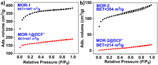 N2 adsorption isotherms (77 K) for (a) MOR-1, MOR-1@DCF−, and (b) MOR-2, MOR-2@DCF−.