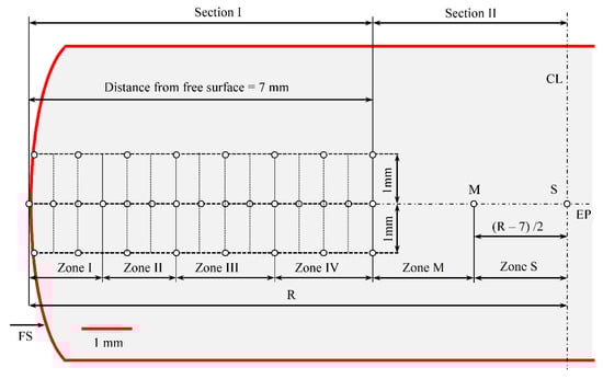 Locations of the testing points (longitudinal cross section) (o—SEM testing points; FS—free surface; EP—equatorial plane; CL—center line; R—equatorial radius).