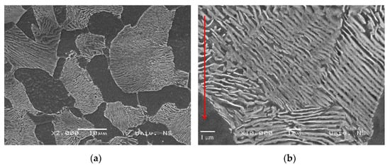 The SEM images of microstructure of undeformed sample: (a) ferrite–pearlite structure of base metal (×2000 magnification); (b) orientation of cementite lamellae (red arrow—direction of upsetting), ×10,000 magnification.