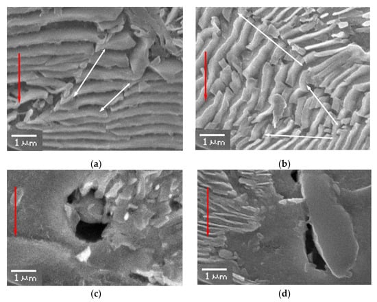 Microstructural damage for strain level εz1 = 0.38: (a,b) fracture of lamellar cementite at different distances from the free surface of the sample (Zone I) ((a) 1 mm, (b) 2 mm); (c,d) nucleation of microvoids by decohesion mechanism ((c) spheroidal inclusion, (d) elongated inclusion (red arrows—direction of upsetting).