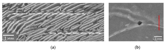 The process of nucleation and growth of microvoids due to the fracture of the cementite lamellae became more intense with an increase in external load and strain degree (εz1 = 0.38 → εz2 = 0.75). It can be seen from Figure 8a that the length of microcracks (marked with C in Figure 8) was almost doubled (maximum 7.5 μm) compared to the previous upsetting stage (εz1 = 0.38). In general, the microcracks propagated through the pearlite colonies at an angle of 45° relative to the cementite lamellae. As mentioned above, the microcracks of the soft ferrite base observed for the specimen strained to εz1 = 0.38 arose only from the process of decohesion at the ferrite–inclusion or ferrite–pearlite boundary surfaces, while other damage mechanisms (in the ferrite base) were not seen. However, in the case of the specimen deformed to εz2 = 0.75, the nucleation of microvoids also occurred at sites where three ferrite grains met, as shown in Figure 8b. Taking into account the fact that the microvoids formed in free ferrite by this mechanism were less than 1 μm, it can be deduced that a high degree of deformation is required for their growth and coalescence.