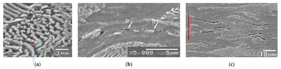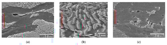 Further deformation of the sample to strain level εz3 = 1.10 was accompanied by a high accumulation of microcracks, which occurred due to the mechanism of decohesion at ferrite grain interfaces or due to the radial expansion of microvoids previously generated at ferrite/pearlite interfaces. Previously formed microvoids, regardless of the nucleation mechanism, propagated rapidly, and a fracture mechanism of microvoid coalescence was observed. As a result of the coalescence of microvoids, small linear cracks (microcracks) were formed. Figure 9a shows a microcrack developed along the ferrite–pearlite colony interface with a tendency to propagate further into the ferrite base. The density of the microcracks in pearlite colonies also increased. These damages were manifested in the form of multiple fractures of the cementite lamellae (Figure 9b), regardless of their original orientation. The fractured parts of the lamellae were about 1 μm. A representative SEM image showing the level of microstructure degradation for εz3 = 1.10 is shown in Figure 9c.