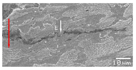 The effect of the coalescence of microcavities was most visible in the region close to the outer surface of the sample, as expected. Figure 11 shows the coalescence of two large microcracks (marked as E) at a distance of 1.5 mm from the free surface, propagating normally to the upsetting direction. This led to the formation of a central crack of macroscopic size at the free surface of the sample (Figure 12).