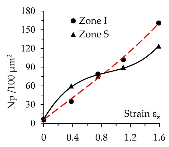 Based on the test plan (Figure 2), an average of 40 different locations were analyzed for each degree of deformation in order to quantify the microcracks in lamellar pearlite colonies. For this purpose, JMicroVision v1.27 software (Figure 13) was employed. In Table 3, the average densities of microcracks in pearlite (Np/100 µm2) colonies are given for different degrees of deformation εz, while Figure 14 shows their distribution in the central zone (Zone S—the zone around point S in Figure 2) and Zone I.