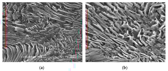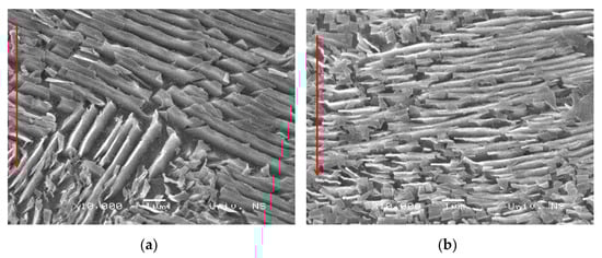 The SEM images of some fractured cementite lamellae of undeformed specimen: (a) Zone I; (b) Zone IV; (×10 000 magnification).