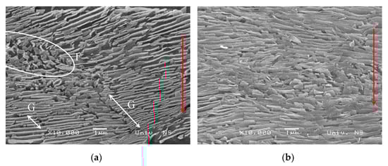 With a further increase in strain (εz3 = 1.10), there was a change in the trend of the microstructural damage evolution and distribution. This can be seen in Figure 17. In Zone I (Figure 17a), the microcracks in the form of multiple fractures of cementite lamellae (area marked F) and the microcracks (marked G) are very noticeable. On the other hand, in Zone IV (Figure 17b), the damages generated due to the fracture of cementite lamellae are also present but the coalescence of the microcavities is not clearly visible, i.e., the level of accumulated damage is lower compared to Zone I. A similar distribution of microcracks can be detected for Zones I and IV at the limiting strain of εz4 = 1.59 (Figure 18).