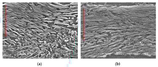 In the initial phase of upsetting, εz1 = 0.38, the stress triaxiality depended mostly on the compressive stress σz. As the value of this stress decreased along the equatorial radius, there was an increase in the value of the β-factor and thus, in the general case, it could be expected that the quantity (density) of microcracks would also increase. However, the obtained results showed the opposite trend. The explanation could be found in the microstructural composition of the tested material. For steels with a normalized ferrite–pearlite microstructure, the orientation of cementite lamellae has a significant influence on the nucleation of microcavities at lower degrees of deformation [2]. In this respect, the SEM analysis showed that cementite lamellae parallel to the compression axis could experience large plastic deformations before fracture (Figure 22). Since the stress triaxiality increased gradually along the workpiece radius for strain level εz1 = 0.38 (βmin = −1.21 at distance of 7 mm from the free surface and βmax = −0.57 at the free surface), and the tensile stress σθ was very small, this led to the conclusion that, in this case, microstructural changes occurred primarily due to the compressive stress component σz in such a way that the cementite lamellae parallel to the load direction were only plastically deformed, while microcavities were exclusively generated in pearlite colonies with random (different, non-parallel) orientations. Considering that the influence of cementite lamella orientation on the development of microcracks was not studied in detail in this research, it can be assumed that a significant number of pearlite colonies with an orientation parallel to the compression axis were present in the area close to the free surface, and therefore fewer microcracks were generated in this area compared with the central part of the specimen. However, with a further increase in strain level, the plastic deformation capacity of the cementite lamellae decreased. In addition, there was a significant increase in the tensile stress σθ, which became the main factor in the process of nucleation and propagation of microcavities. Both these phenomena led to the change in the trend of the distribution of the microcrack density, where the number of microcracks in pearlite colonies increased with an increase in the stress triaxiality and the equatorial radius.