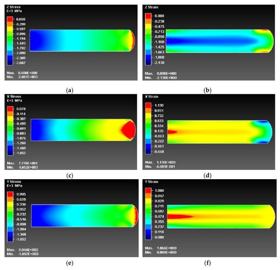 Distribution of stress and strain components for the limiting strain (εz4 = 1.59): (a) axial stress σz; (b) axial strain εz; (c) radial stress σr; (d) radial strain εr; (e) circumferential stress σϴ; (f) circumferential strain εθ.