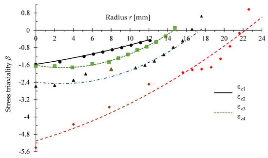 From the point of view of microcrack nucleation and propagation, i.e., workability potential, the stress field in the outermost zone of the sample was disadvantageous, since the circumferential tensile (positive) stress σϴ was dominant (Figure 19). On the other hand, the levels of compressive stresses (axial σz and radial σr) were low in this zone and therefore these stresses did not have a significant effect on the foregoing processes. It should be noted that in the central zone of the workpiece, all three stresses were compressive, with high (negative) values. It can therefore be said that distribution of the stress components σz and σϴ along the equatorial plane was unfavorable, since on approaching the free surface the value of the axial compressive stress σz decreased progressively, while the compressive circumferential stress σϴ shifted to a tensile stress. A similar conclusion can be drawn from the distribution of the stress triaxiality β along the equatorial radius r, which is shown in Figure 20 for different strain levels. A common feature for all upsetting stages was a steady increase in the values of the β-factor from the center to the outer surface of the specimen, which was particularly noticeable in the final phase. The graph of the functions β = f(r) confirms the well-known fact that the equatorial free surface of the barreled cylindrical specimen is a critical zone of deformation. It is also clear that the influence of the tensile stress component σθ, in terms of material workability performance, increases with an increase in strain level.