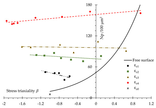 In contrast to the linear approximation for the microcrack density distribution along the equatorial radius, an exponential function model was used to describe the increase in microcracks at the free surface (Figure 22). The intensity of the damage accumulation was particularly large for positive values of the stress triaxiality, which confirms the dominant influence of the tensile stress σθ on the microcrack nucleation.