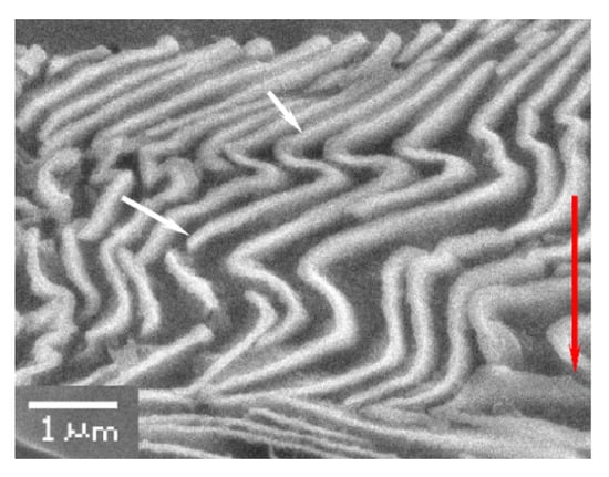 Deformation of cementite lamellae (εz2 = 0.75, Zone IV) (red arrow—direction of upsetting).