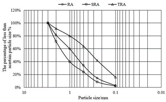 The recycled aggregate was taken from the waste concrete of a demolition site in Shaoxing and produced by Shanghai Youhong Environmental Technology Co., Ltd. (Shanghai, China). The maximum particle size was less than 10 mm, and most particles were round and granular having a blue-gray color. In order to study the effect of recycled aggregates’ particle gradation, by referring to the particle sieving curve of Peng Wan [22], two additional recycled aggregates with different particle gradations were designed as test materials on the basis of natural gradation. The mass fraction of each particle size is shown in Table 4 and Figure 1.