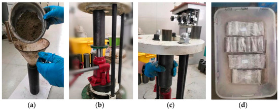 According to the Standard for Geotechnical Test Methods (GBT 50123-2019) [23], the sample preparation process can be divided into the following steps, and the specific process is shown in Figure 2: