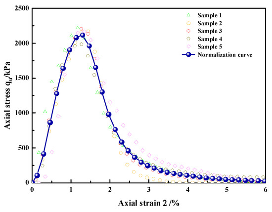 Residual strength is one of the important physical and mechanical properties, and refers to the residual ability of soil to resist external loads after macroscopic failure; it can be obtained from the stress–strain curve throughout the whole process. [26,27]. According to the “Standards for Geotechnical Test Methods” (GBT 50123-2019) [23], the maximum strain of the unconfined compressive strength test is generally taken as the peak strain plus 3%–5%, and the peak strain of this test is kept between 1%–2%, so the maximum strain range of the test is 4%–7%. The residual strength in this study was defined as the stress value corresponding to the strain of 6% on the stress–strain curve, as plotted in Figure 6.