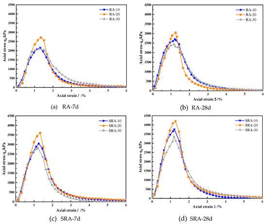 Figure 4 shows that the stress–strain curves of all samples have a hump shape, and the stress–strain curves of samples with different recycled sand contents and different particle gradations basically show the same change law; that is, the stress first increases and then decreases with the increase in strain, representing softening curves. These stress–strain curves can be roughly divided into three stages of development: (1) The elastic deformation stage (strain is 0%–1%). The specific performance is that the slope of the stress–strain curve increases, and the stress increases almost linearly with the strain. The soil particles in the sample were compressed by the applied stress, but did not fail. (2) The development stage of plastic deformation (strain is 1%–1.5%). The curve begins to deviate from the straight line at this stage, and the stress growth is not obvious. At this time, due to the continuous increase in the pressure, the structure of the soil particles began to be destroyed, the gaps between the particles were continuously compacted, and micro-cracks appeared in the sample. (3) The softening stage (strain is 1.5%–6%). When the stress exceeds the peak value, the stress gradually decreases with the continuous increase in the strain. At about 3% to 5% greater than the strain of the peak strength, the curve begins to flatten out and maintains a certain residual strength. At this stage, the cracks in the sample gradually expand and extend until the sample cracks and fails. Further analysis found that the change in the stress–strain curve at the age of 7 d is slower than that at the age of 28 d. Among the three particle grading samples, the stress–strain curve of the SRA sample is the steepest, TRA is second, and RA is the slowest.
