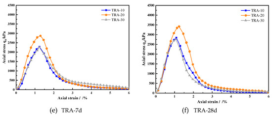 Stress–strain relationship curve of samples with different particle grading recycled aggregate contents: (a) RA-7d; (b) RA-28d; (c) SRA-7d; (d) SRA-28d; (e) TRA-7d; (f) TRA-28d.