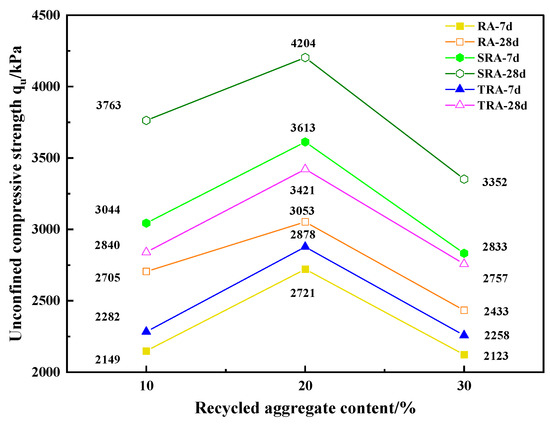 At 7 and 28 d, the unconfined compressive strengths of RA, SRA, and TRA samples first increased and then decreased with the increase in recycled aggregate content. The maximum unconfined compressive strength was reached when the recycled aggregate content was 20%, and minimum was reached when the recycled aggregate content was 30%. When the recycled aggregate content was 20%, the unconfined compressive strengths of RA-7d and RA-28d samples reached 2721 and 3053 kPa, respectively, which were 25.6% and 12.9% higher than those having recycled aggregate content of 10%. The unconfined compressive strengths of SRA-7d and SRA-28d samples reached 3613 and 4204 kPa, respectively, which were 18.7% and 11.7% higher than having with recycled aggregate content of 10%. The unconfined compressive strengths of TRA-7d and TRA-28d samples reached 2878 and 3421 kPa, respectively, which were 26.1% and 20.5% higher than those having recycled aggregate content of 10%. It can be found through the analysis that the recycled aggregate content has a great influence on the unconfined compressive strength of samples, which is also consistent with the research results obtained by Li Yugen, Li Fang et al. [24,25]. There are a large number of clay particles in soft soil. Adding an appropriate quantity of recycled aggregates to soft soil can improve the particle gradation of the soil. During cement hydration and the nano-MgO pozzolan reaction, a large amount of cement is produced, which effectively bonds soft soil with recycled aggregate. This provides the skeleton force for the soft soil, thereby further improving the bearing capacity of the cement soil. However, when an excessive amount of recycled aggregate is added to cement soil, the contact area between the recycled aggregate and soft soil increases greatly, and the quantitative cement and nano-MgO cannot fully contact the recycled aggregate. Thus, the provided cementing force is too low, resulting in a low level of cohesion between the soil bodies and a downward trend in the strength of the cement soil. Therefore, in actual construction projects, it is necessary to strictly control the recycled aggregate content in cement soil to achieve the optimal application effect.