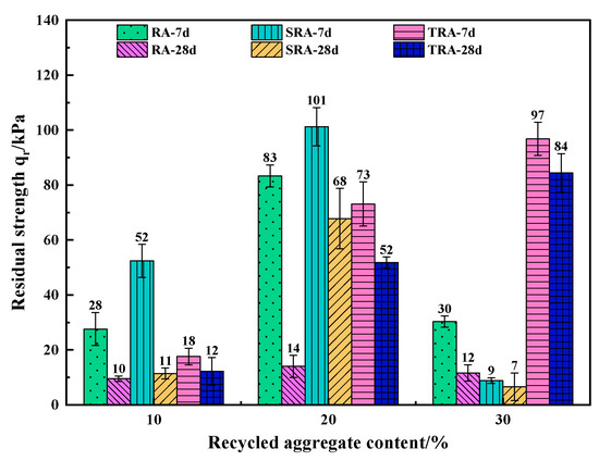 Figure 6 shows that the residual strength of samples with different recycled aggregate contents under three particle gradations is higher at 7 d than that at 28 d. When the recycled aggregate content is 20%, the residual strength of the SRA-7d sample is the largest, reaching 101 kPa, which is 48.5% higher than that of the SRA-28d sample. Comparing the variation law of the residual strength of samples with different recycled aggregate contents under three particle gradations, the residual strengths of RA and SRA samples first increase and then decrease with the increase in recycled aggregate content. When the recycled aggregate content is 20%, the maximum value is reached. Compared with 10% content, the residual strength of RA-7d, RA-28d, SRA-7d, and SRA-28d samples is increased by 196.4%, 40%, 94.2%, and 518.2%, respectively, when the recycled aggregate content is 20%. The residual strength of TRA samples increases gradually with the increase in recycled aggregate content, and reaches the maximum value with 30% content. Compared with 10% content, the residual strength of TRA-7d and TRA-28d samples is increased by 438.9% and 600.0%, respectively. Compared with 20% content, the residual strength of TRA-7d and TRA-28d samples is increased by 32.9% and 61.5%, respectively.