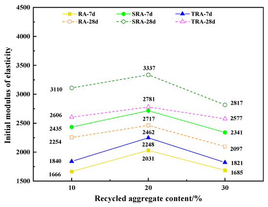 Figure 7 shows that the initial elastic modulus of RA-28d, SRA-28d, and TRA-28d samples are all higher than those of RA-7d, SRA-7d, and TRA-7d samples with three recycled aggregate contents, indicating that the increase in curing age can improve the ability of samples to resist deformation to a certain extent. At 7 and 28 d, the initial elastic modulus values of RA, SRA, and TRA samples first increased and then decreased with the increase in recycled aggregate content. When the recycled aggregate content was 20%, the initial elastic modulus reached the maximum value, indicating that the sample had the best ability to resist deformation and the highest stiffness. Furthermore, the comparison of the initial elastic modulus of the three particle graded samples shows that at 7 and 28 d, SRA samples show the best resistance to deformation, followed by TRA and, finally, RA.
