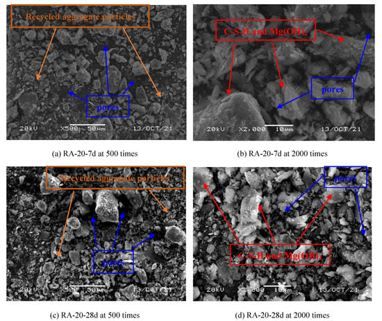 Through the four SEM images in Figure 8, the microstructure changes of RA samples at two ages can be further analyzed. At 500 times magnification, it can be clearly seen in Figure 8a that there are a large number of pores in the sample, and the shape of recycled aggregate particles is very obvious. There is a certain interval between particles and the connection is not tight, and the number of pores of the sample in Figure 8c is relatively low compared with that in Figure 8a. The arrangement of recycled aggregate particles is dense and the connection between particles is strengthened. The overall structure is improved. Under the 2000 times magnification, Figure 8b shows the hydration products C-S-H and Mg(OH)2 of cement and nano-MgO in the RA sample. The hydration products wrap the recycled aggregate particles together, which enhances the bonding between the loose recycled aggregate particles and makes the overall structure of the sample more complete. However, the larger pores in the sample can still be seen. In Figure 8d, the hydration products C-S-H and Mg(OH)2 are widely dispersed. There are only small pores in the sample, and the overall structure is relatively compact. To summarize, the overall structure of RA samples at the age of 28 d is more compact than that at the age of 7d, and the number and size of pores are reduced. It can thus be proved that the unconfined compressive strength of samples increases with the increase in age.