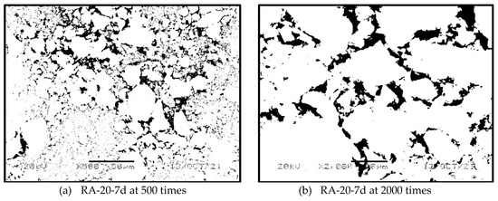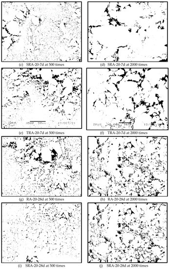 It can be seen from Figure 9 that RA, SRA, and TRA samples at 7 d have more pores than those at 28 d. Furthermore, in the black and white binarized image magnified 2000 times, it can be seen that the pores of samples at 7 d are denser and there are a large number of pores having larger diameters, whereas the pores of samples at the 28 d are relatively small and more widely distributed. In addition, SRA samples have the smallest porosity, followed by TRA samples, and RA samples have the largest porosity.