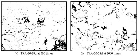 Black and white binary images of RA, SRA, and TRA samples: (a) RA-20-7d at 500 times; (b) RA-20-7d at 2000 times; (c) SRA-20-7d at 500 times; (d) SRA-20-7d at 2000 times; (e) TRA-20-7d at 500 times; (f)TRA-20-7d at 2000 times; (g) RA-20-28d at 500 times; (h)RA-20-28d at 2000 times; (i) SRA-20-28d at 500 times; (j) SRA-20-28d at 2000 times; (k) TRA-20-28d at 500 times; (l) TRA-20-28d at 2000 times.