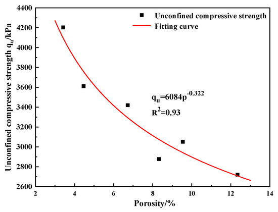The porosity of samples when magnified 500 times is lower than that when magnified 2000 times. This is because the sample range involved in SEM images magnified 500 times is larger than that for images magnified 2000 times, and the corresponding porosity decreases. Therefore, the weighted porosity of WPRA samples can be calculated from this. The weight number of porosity for 500 times magnification was set to 4, and that for 2000 times magnification was set to 1, and the final calculation results are listed in Table 8. In order to further study the relationship between the compressive strength and the porosity of RA, SRA, and TRA samples, linear fitting was carried out to obtain their mathematical relationship, as shown in Equation (4), and the fitting curve is drawn as shown Figure 10. It can be seen from the fitting results that the unconfined compressive strength of the samples has a negative exponential power function relationship with porosity.