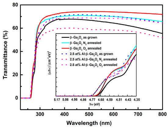 Transmittance of undoped β-Ga2O3 and 2.5 mole% Al-doped β-Ga2O3 single crystals as-grown and as-annealed process.