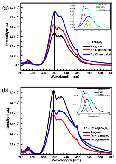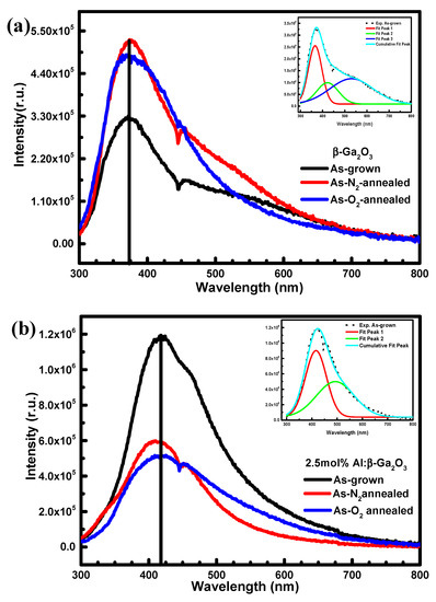 PL emission spectra of (a) pure and (b) 2.5 mole% Al-doped β-Ga2O3 crystal.