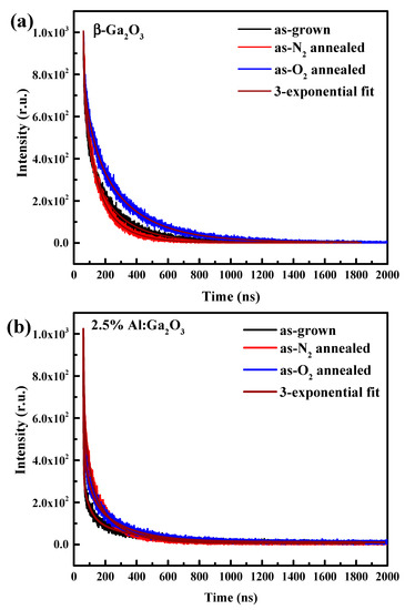 PL decay curve profiles are represented in Figure 4. Decay curves were well fitted with 3-exponential functions for undoped and Al doped β-Ga2O3 using the most accurate time-resolved analysis as follows [26];