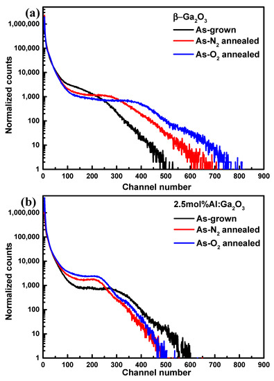 Pulse height spectra profiles are represented in Figure 5. It can be seen from Figure 5a that the light yield of the undoped β-Ga2O3 single crystal after annealing is increased compared with that of the as-grown sample. However, in Figure 5b, the light yield of the annealed Al-doped sample decreased compared with the as-grown sample. This is basically consistent with the trend of XEL and PL spectra. Besides, the undoped β-Ga2O3 annealed in the same atmosphere have higher light yields than Al-doped β-Ga2O3, which is consistent with the trend reported by Galazka et al. [8] that the introduction of Al element may reduce the light yields of β-Ga2O3. The mechanism behind this result needs further study.