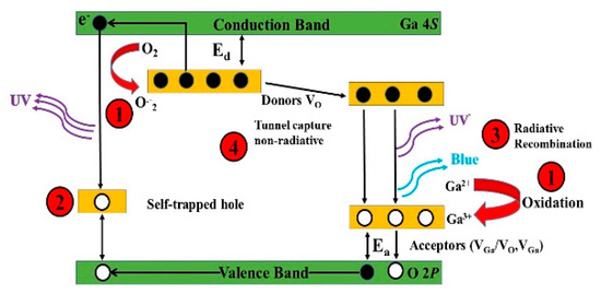 - Increases Ga3+ ions and VGa acceptors, as well as reduces VO donors by filling the oxygen vacancies VO with oxygen and forming O2− (process num. 1).