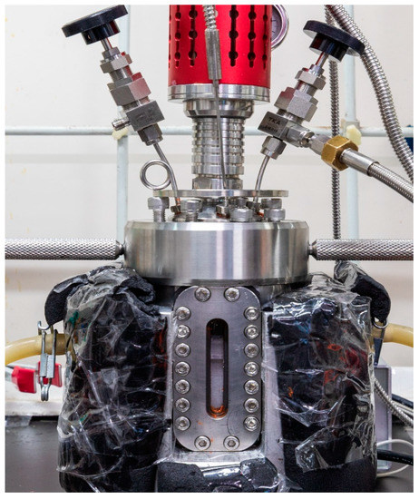 The device used in the experiment was a high-pressure stainless-steel reactor (Xi’an Taikang Biotechnology Co., Ltd., Xi’an, China) with a volume of 100 mL and a maximum pressure of 12.5 MPa. As shown in Figure 2, the reactor was equipped with an inflation valve, liquid-taking valve, magnetic–mechanical coupled stirring, and a sapphire window for observing the crystallization process. The high pressure of the reactor was provided by a nitrogen steel cylinder (Tianjin Liufang Industrial Gas Distribution Co., Ltd., Tianjin, China) with the nitrogen purity ≥ 99.999% and the initial pressure ≥ 14.5 MPa. The pressure of the reactor was controlled by the pressure-reducing valve, and the control accuracy was 0.1 MPa. All experiments at 0.1 MPa in this paper were carried out at atmospheric pressure. A thermostat (CF41, Julabo Technology Co., Ltd., Seelbach, Germany) and jacket were used to control the temperature of the reactor with a temperature accuracy of 0.1 K.