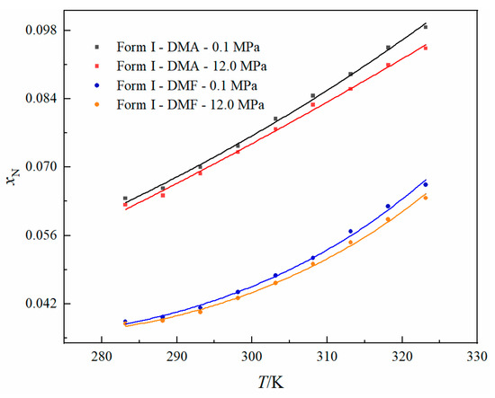 Mole fraction solubility of RBV (Form I) in dimethylacetamide (DMA) and dimethylformamide (DMF) at 0.1 MPa and 12.0 MPa: symbol—experimental values, curve—calculated values by the modified Apelblat model.