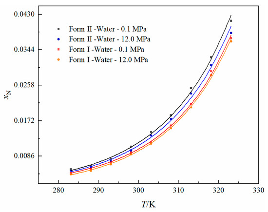 Mole fraction solubility of RBV (Form I and Form II) in water at 0.1 MPa and 12.0 MPa: symbol—experimental values, curve—calculated values by the modified Apelblat model.