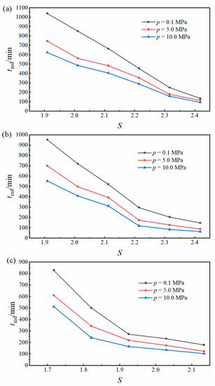 The induction time of cooling crystallization of RBV (Form II) in water at different supersaturation and pressure: (a) 283.15 K, (b) 293.15 K, (c) 303.15 K.